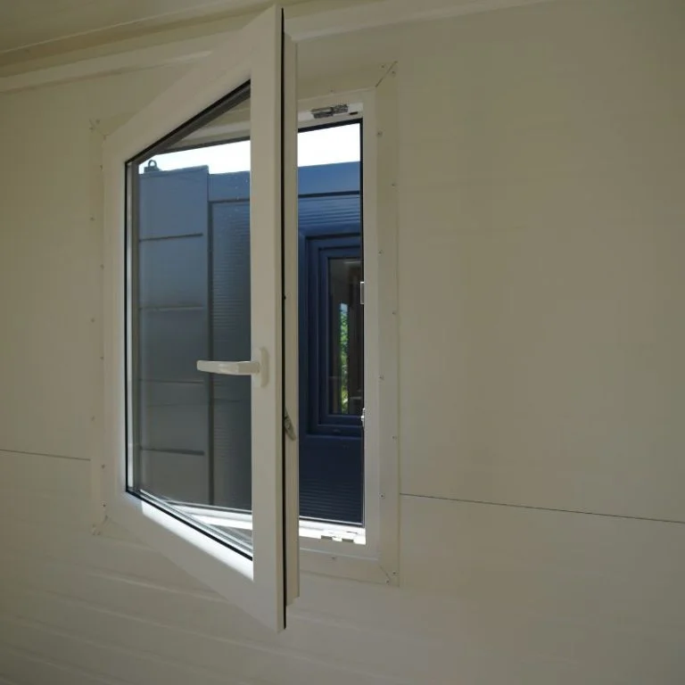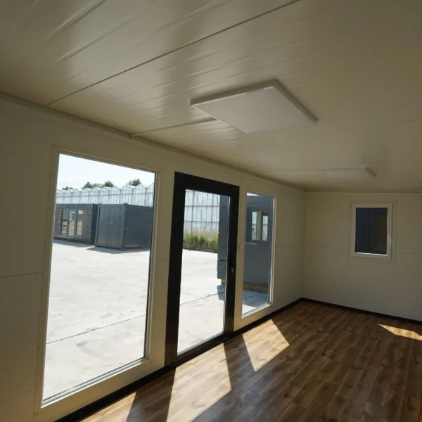 Comme vous pouvez le constater sur nos images, le Bungalow de chantier Stockholm est éclairé majoritairement d’une lumière naturelle grâce aux deux grandes fenêtres situées à coté de la porte vitrée en acier. Il fait nuit ? Vous disposez de deux lumières LED contrôlées à l’aide d’un interrupteur pour garantir une luminosité suffisante pour travailler dans votre bureau conteneur.
