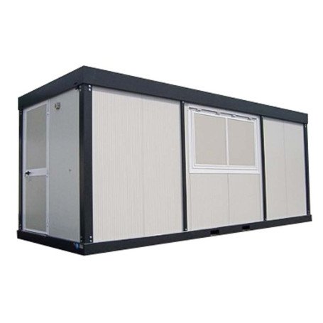 Le Bungalow Snack 6 mètres est équipé d’une porte pleine dimensions 104 x 220 cm (90 cm de passage) et d’une fenêtre type snack sans vitrage dimensions 204 x 120 cm avec volet basculant sur piston à gaz et loquet de condamnation intérieur.