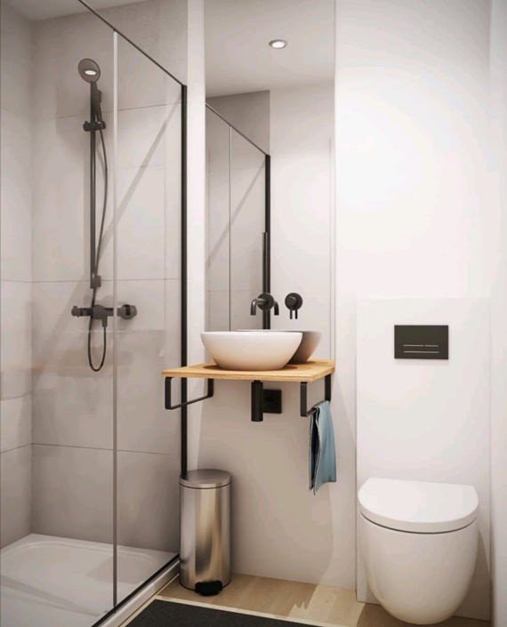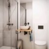 Chaudière à eau chaude 30L, receveur de douche 120×80, pare-douche en verre, robinet de douche, plan de travail (stratifié), miroir, lavabo sur plan, siphon de lavabo avec prise clic-clac, robinet encastré, cuvette de WC, radiateur/chauffe-serviettes électrique.