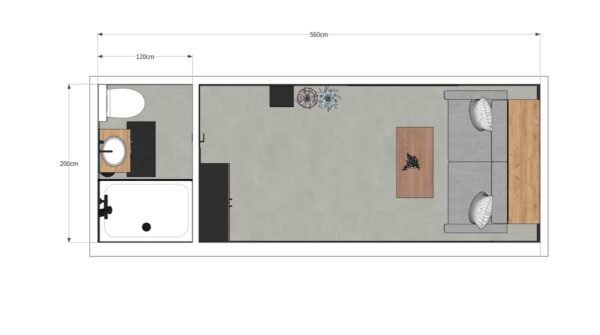 Dimensions intérieures : 2,00 x 5,60 x h 2,45 m, surface intérieure brute 11,2 m2.