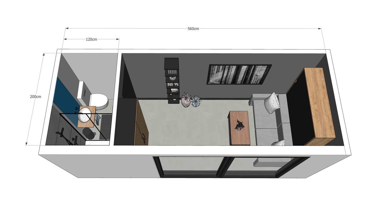 Dimensions intérieures : 2,00 x 5,60 x h 2,45 m, surface intérieure brute 11,2 m2.